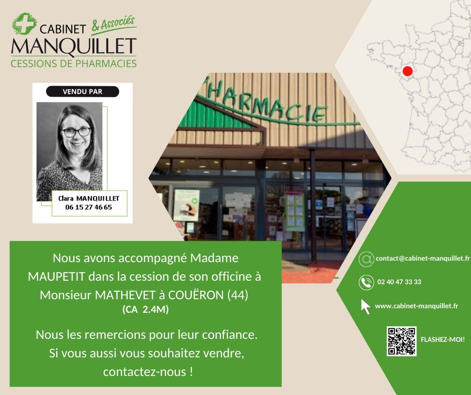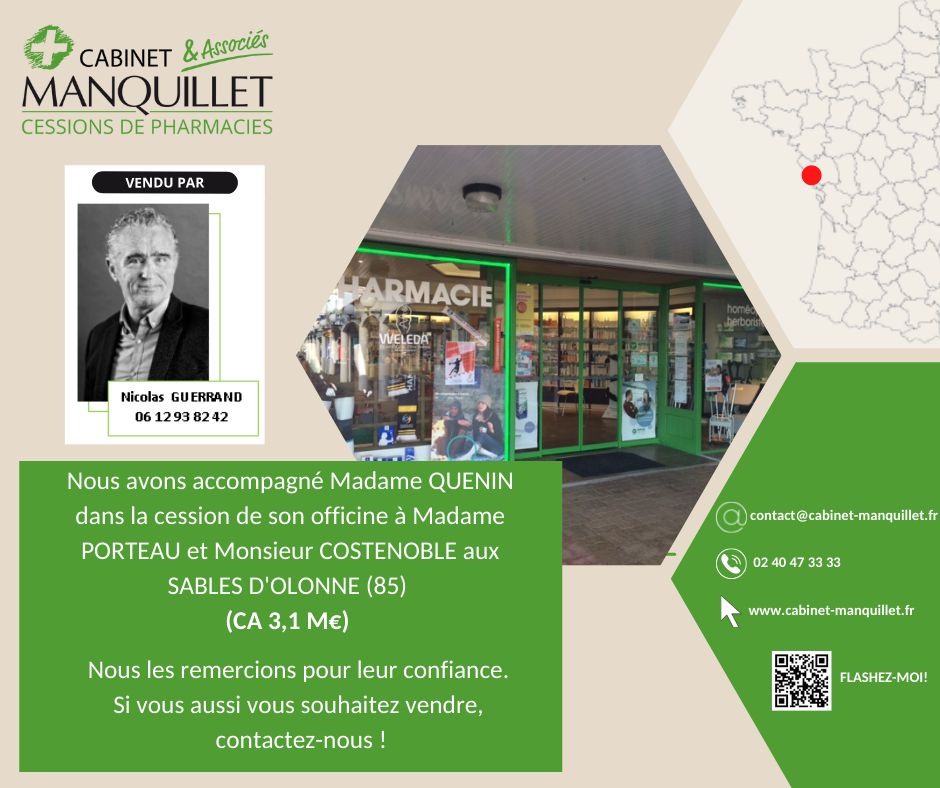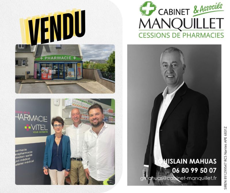 "J'ai pu mener à son terme mon projet de fusion d'officine grâce à l'aide de Mr Ghislain Mahuas du CABINET MANQUILLET, spécialiste en transactions de pharmacie en Bretagne. Mr Mahuas, a su se rendre disponible, à l'écoute et avec de précieux conseils pour que le rachat de l'officine de ma consoeur puisse se dérouler dans les meilleures conditions pour chacun. Merci encore Mr Mahuas et le cabinet Manquillet. Je recommande."